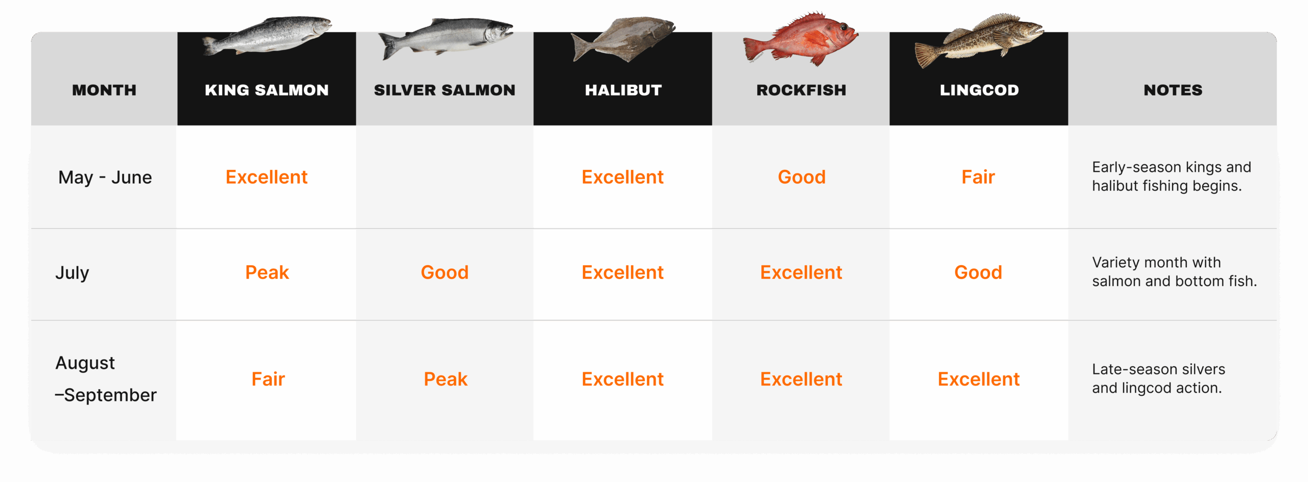 Every trip is led by licensed, experienced guides who have spent decades exploring these local waters. With over 60 years of combined guiding experience, the team knows when and where to find each species throughout the season.
