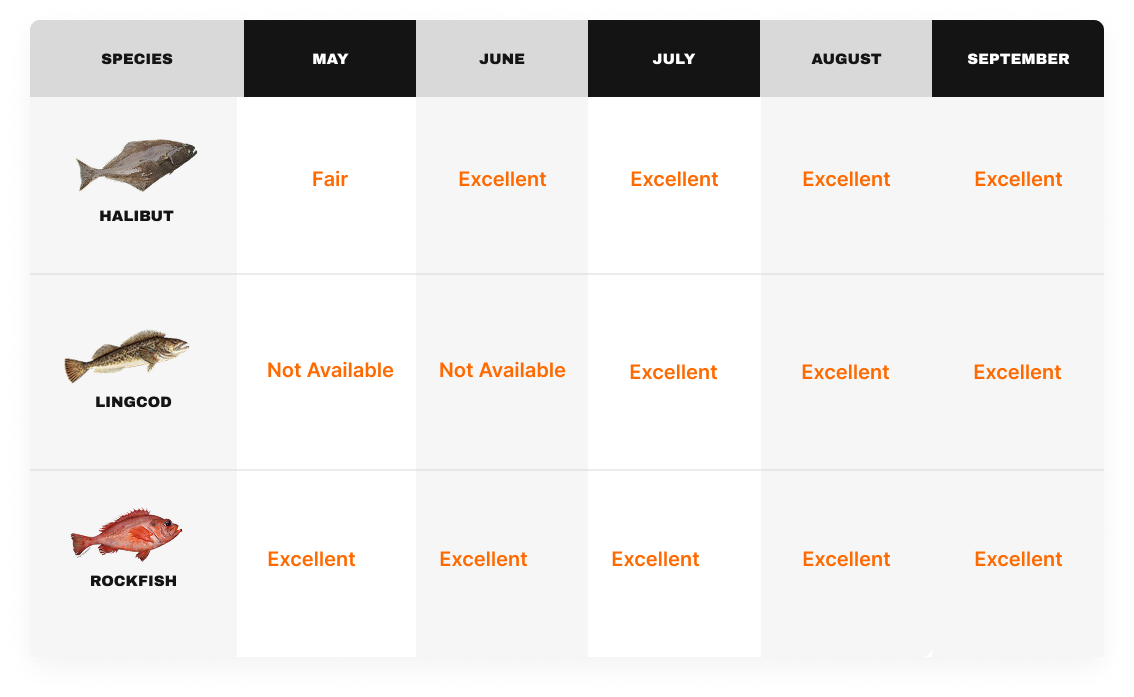 Rockfish are available all season and can be targeted on the same trips as halibut or lingcod. Light-tackle fishing makes this experience accessible for anglers of all skill levels, and their mild flavor makes them one of Alaska’s most popular eating fish.