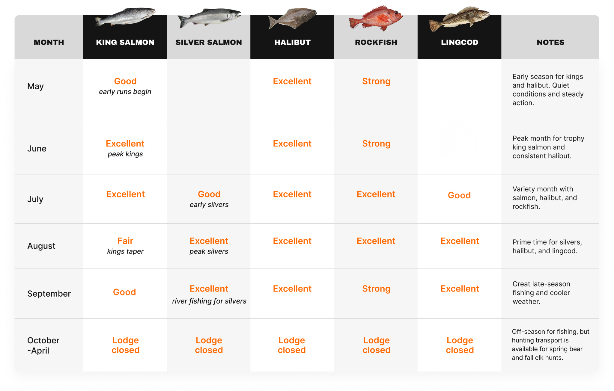 Raspberry Island Lodge operates seasonally, typically from May through September, when weather and daylight are ideal for fishing and wildlife viewing. Each month offers unique highlights from spring king salmon runs to late-summer silver salmon and lingcod action.
