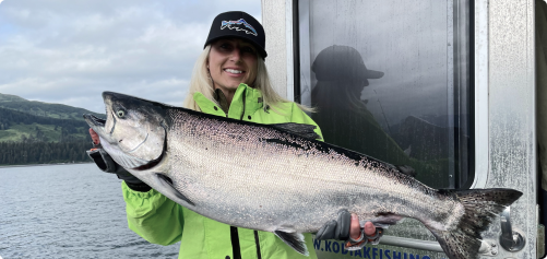 King salmon are the largest of the Pacific salmon species and one of Alaska’s most sought-after fish. They begin arriving in the waters around Raspberry Island as early as May and are most commonly encountered through mid-summer. While kings may still be caught incidentally in August while targeting silver salmon, they are not typically a primary focus at that time due to the wide variety of species available each day.